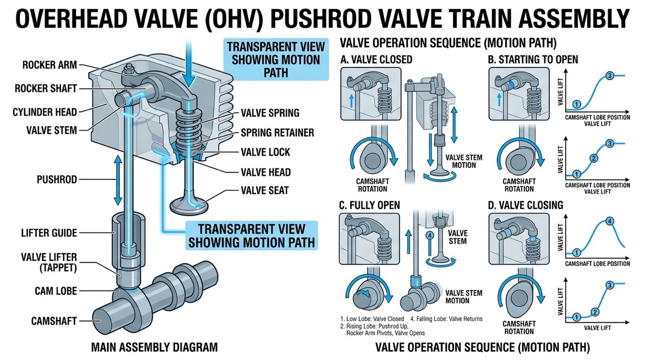 La sequenza completa è la seguente: l'albero a camme ruota → la camma solleva il bilanciere → il bilanciere spinge l'asta di spinta → l'asta di spinta fa perno al bilanciere → il bilanciere apre la valvola contro la pressione della molla. Quando la camma ruota oltre il punto di massima alzata, la molla della valvola inverte la sequenza.