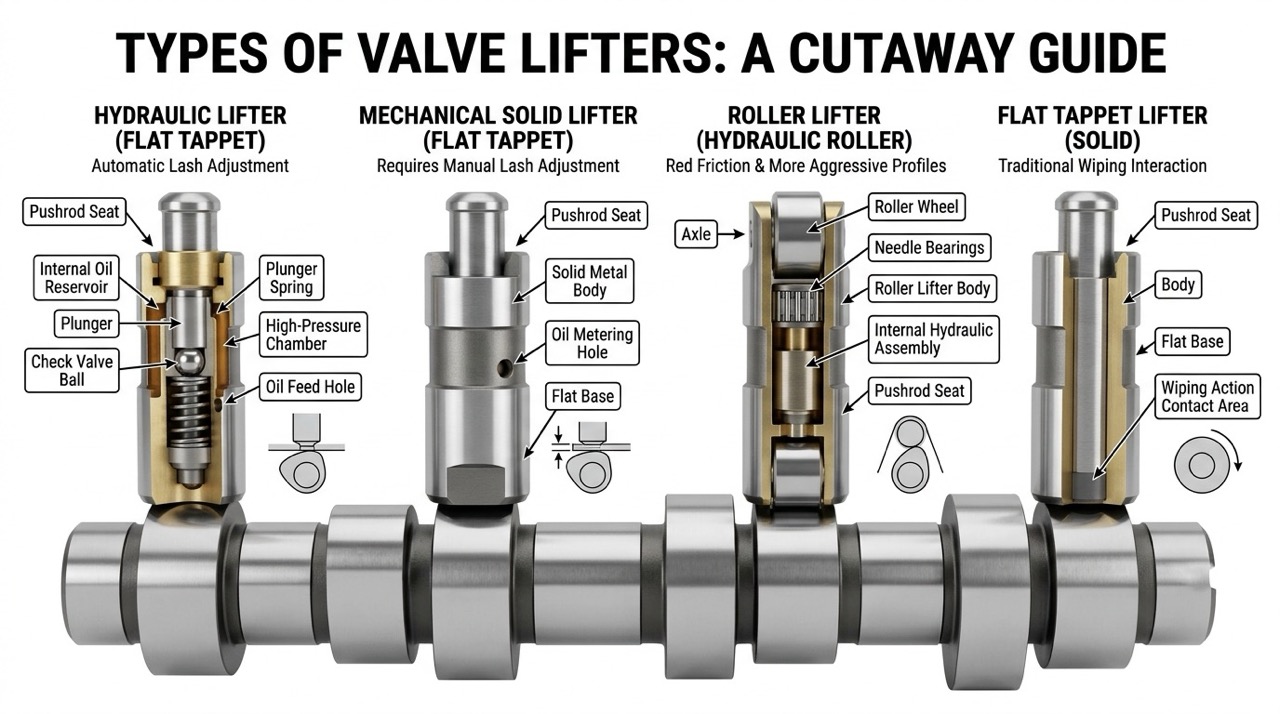 Il tipo di punteria influisce notevolmente sulle caratteristiche del motore. Le punterie idrauliche garantiscono un funzionamento silenzioso e senza manutenzione per la guida quotidiana. Le punterie meccaniche offrono un controllo preciso delle valvole per applicazioni ad alte prestazioni. Le punterie a rulli riducono l'attrito per una maggiore efficienza.