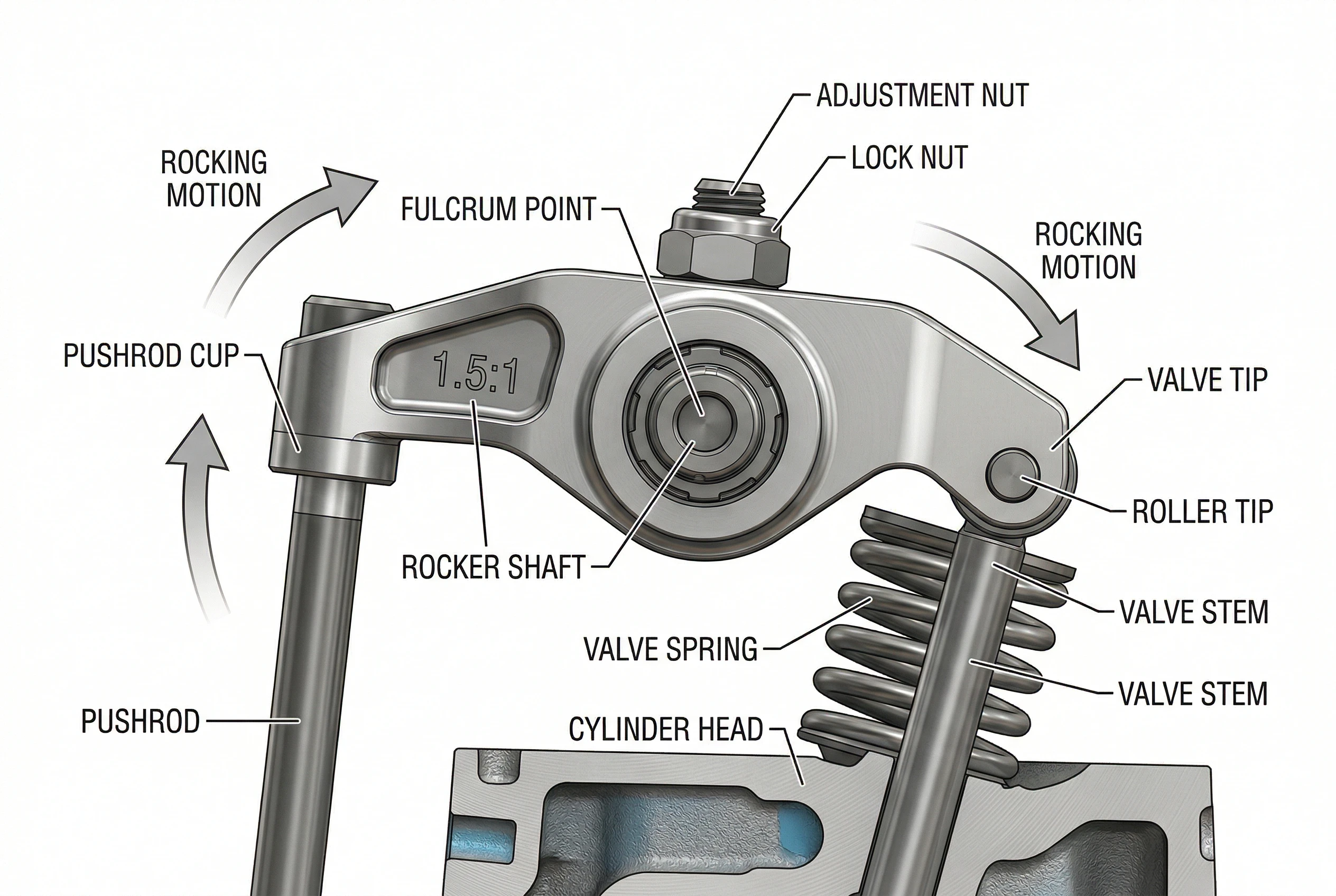 ratio between output and input arm lengths. A 1.5:1 ratio means the valve moves 1.5 times farther than the pushrod. Higher ratios like 1.6:1 increase valve lift, improving airflow and power potential but also increasing stress on components.