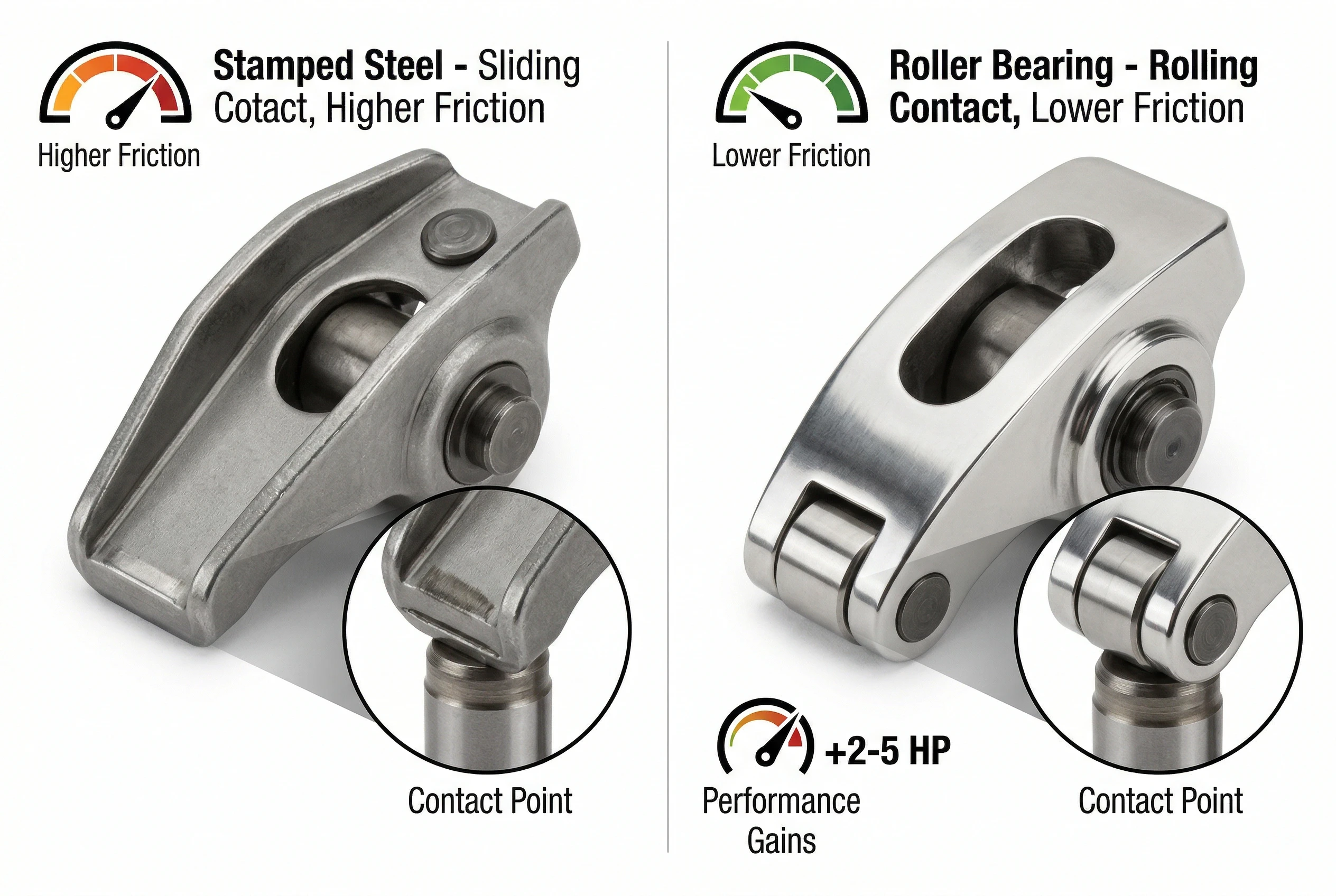 Roller rocker arms use a roller bearing at the valve stem contact point, creating rolling contact instead of sliding friction. This reduces friction by 30-50%, freeing up power and reducing wear. Stamped rocker arms use simple sliding contact, which creates more friction but costs significantly less.
