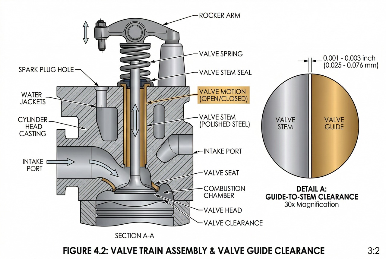 Vodítka ventilů zajišťují, že se ventil pohybuje dokonale přímočarě kolmo k sedlu ventilu. Tento přímočarý pohyb je nezbytný pro správné utěsnění ventilu. Když se ventil zavírá, jeho plocha se musí dotýkat sedla ventilu rovnoměrně po celém obvodu. Jakékoli chvění nebo špatné vyrovnání způsobuje nerovnoměrný kontakt, což vede ke ztrátě komprese a možnému spálení ventilu.