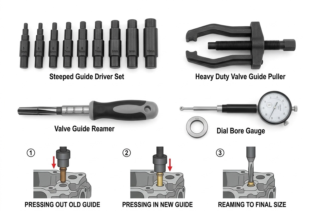 Výměna vodítka ventilů vyžaduje kompletní demontáž hlavy válců. Hlava musí být demontována z motoru a všechny ventily musí být demontovány. Tento proces vyžaduje specializované nástroje, takže jej obvykle provádějí mechanické dílny nebo zkušení výrobci motorů.