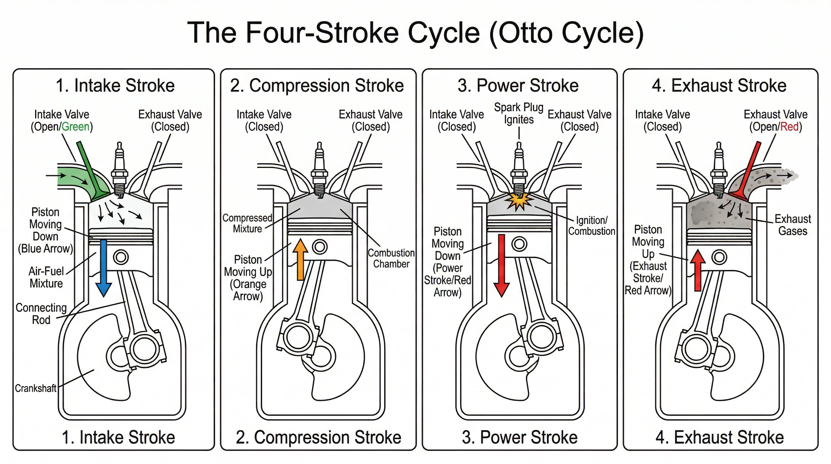 Engine valves play a crucial role in each phase of the four-stroke combustion cycle: