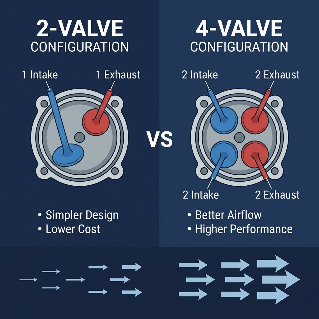 The 4-valve design allows for better airflow because the total valve area is greater, even though individual valves are smaller. This configuration also allows for a more centrally located spark plug, improving combustion efficiency.