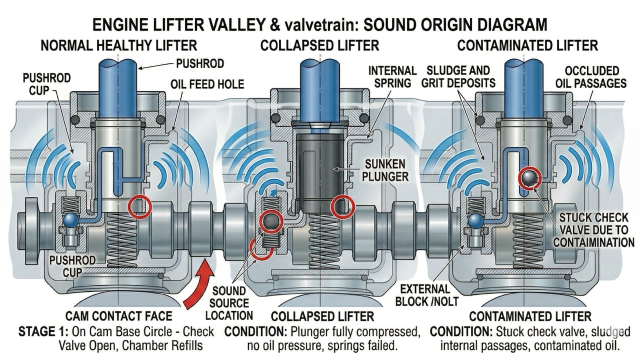 Стук толкателей обычно исходит из области углубления для толкателей в блоке цилиндров или из области головки цилиндров, где толкатели соприкасаются с штангами. Звук обычно описывается как металлический стук, позвякивание или щелчки. Громкость может варьироваться от едва слышимой до довольно громкой, в зависимости от серьезности основной проблемы.