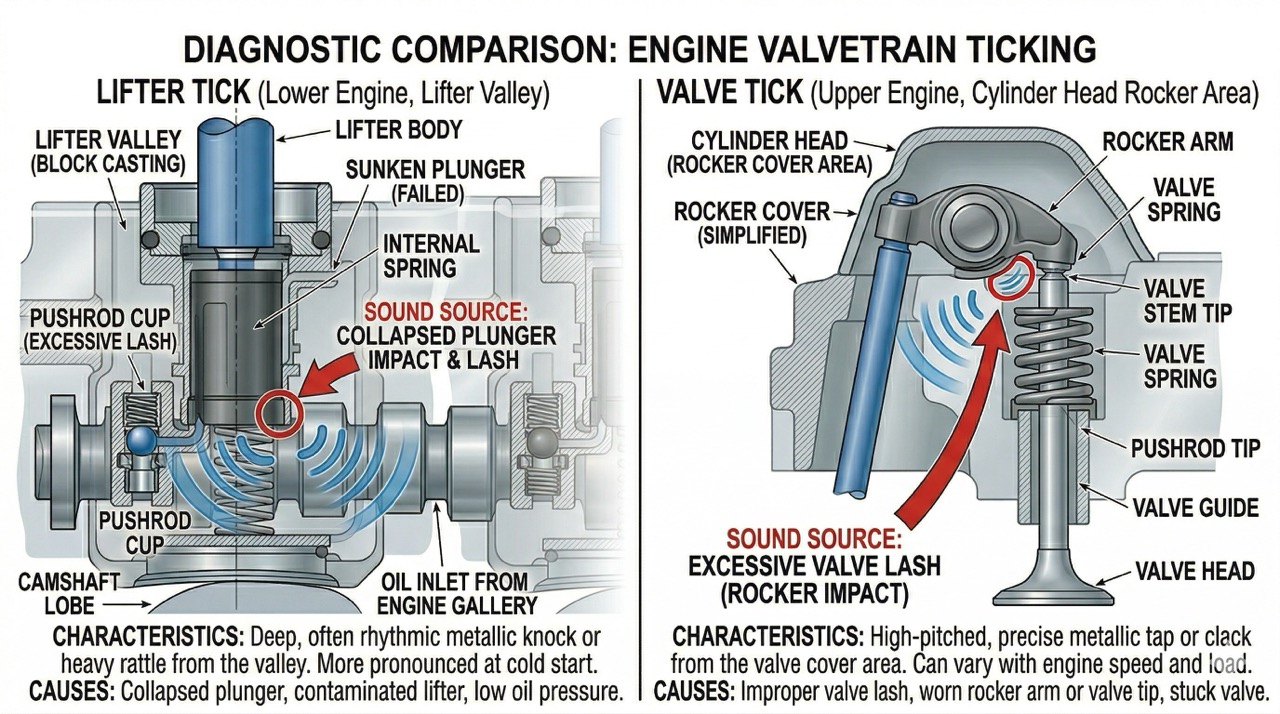 Хотя оба звука издают ритмичное тиканье, тиканье гидрокомпенсаторов и тиканье клапанов имеют разное происхождение и характеристики. Тиканье гидрокомпенсаторов возникает из-за неисправности самого гидрокомпенсатора или проблем со смазкой. Тиканье клапанов возникает из-за контакта клапана и коромысла, как правило, из-за чрезмерного зазора клапана или износа компонентов.