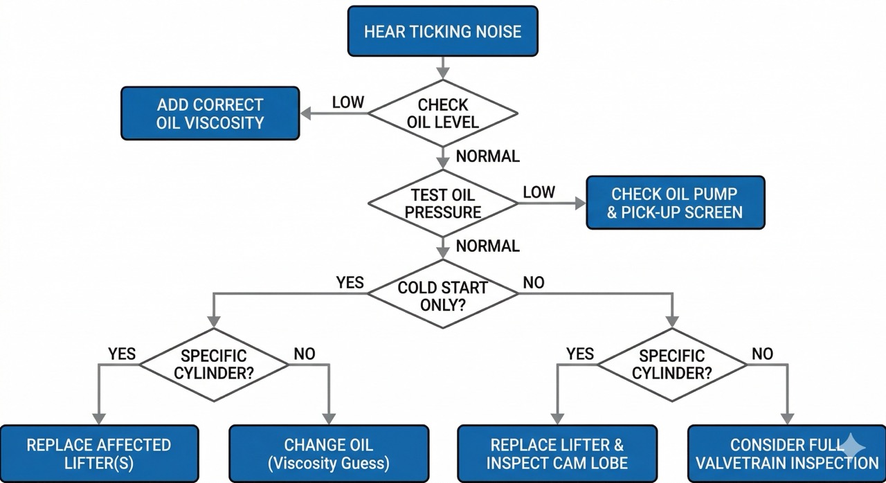 Основной симптом — ритмичный стук или тиканье двигателя, синхронизированное с оборотами двигателя. Шум обычно наиболее заметен на холостом ходу и может уменьшаться на более высоких оборотах. Стук при холодном запуске, исчезающий после прогрева, указывает на проблемы с давлением или вязкостью масла, а не на механическую неисправность.