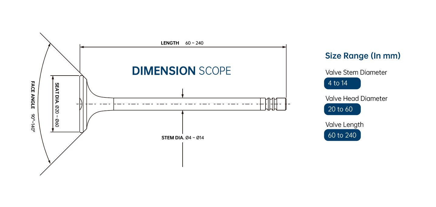 Ang TOPU ay gumagawa ng mga balbula na partikular na idinisenyo para sa mas mataas na displacement at mas mataas na performance demands. Ang mga intake valve ay gumagamit ng 21-4N o 21-2N high-strength stainless steel na may temperature rating na hanggang 850°C. Ang mga balbulang ito ay nagtatampok ng optimized head profile para sa pinahusay na daloy at makukuha sa oversized diameters upang bumagay sa mga bored engine.